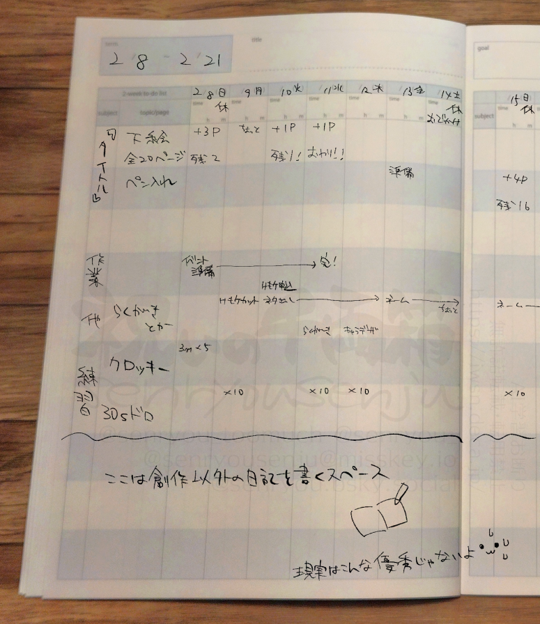 教科や科目で分ける縦の欄を『この作品』の『下書き』『ペン入れ』みたいに分けて記入しています。原稿だけじゃなく『らくがき』や『練習』、『イベント準備』なども項目ごとに分割。同人活動は毎日の作業が連続しているので、続けてやっている作業を日付軸(横方向)で記録しやすいのが気に入っています。
